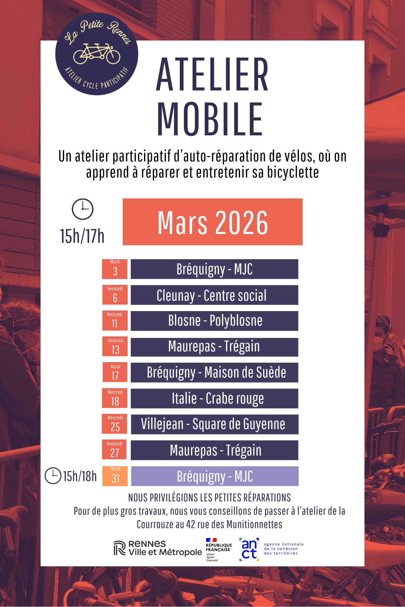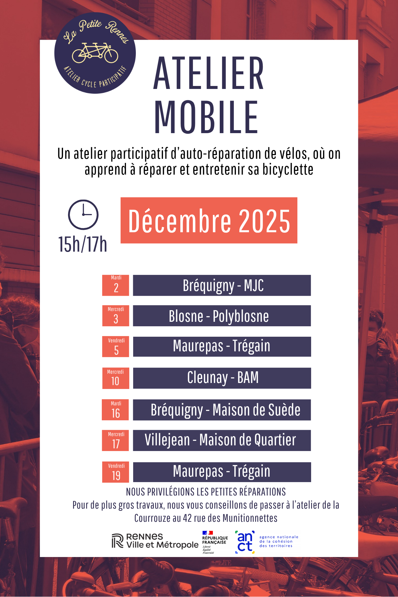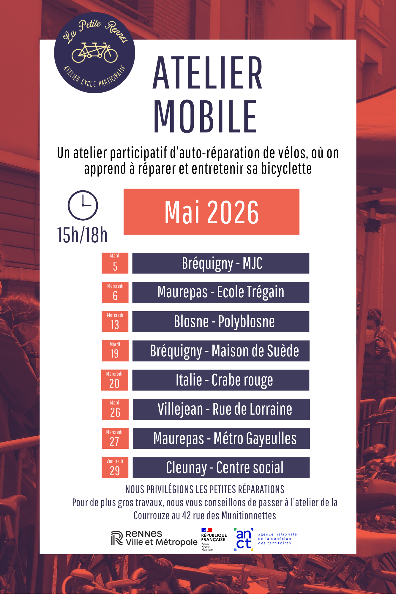 Ces ateliers sont essentiellement à destination des habitant·e·s des quartiers politiques de la ville de Rennes (Maurepas, le Blosne, Bréquigny, Cleunay, Villejean) mais vous pouvez nous retrouver ponctuellement à d’autres endroits de la ville.