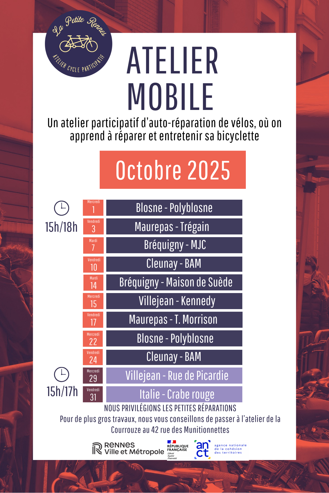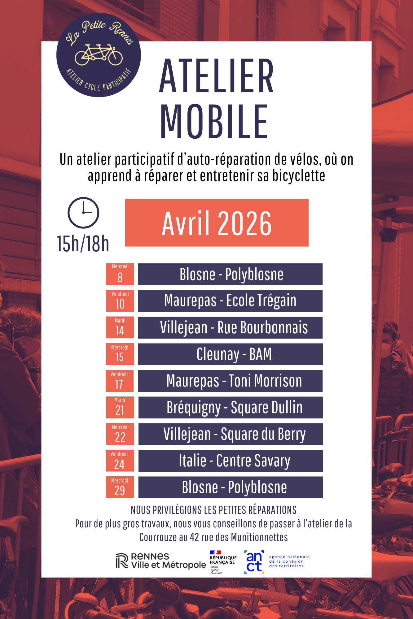 Ces ateliers sont essentiellement à destination des habitant·e·s des quartiers politiques de la ville de Rennes (Maurepas, le Blosne, Bréquigny, Cleunay, Villejean) mais vous pouvez nous retrouver ponctuellement à d’autres endroits de la ville.